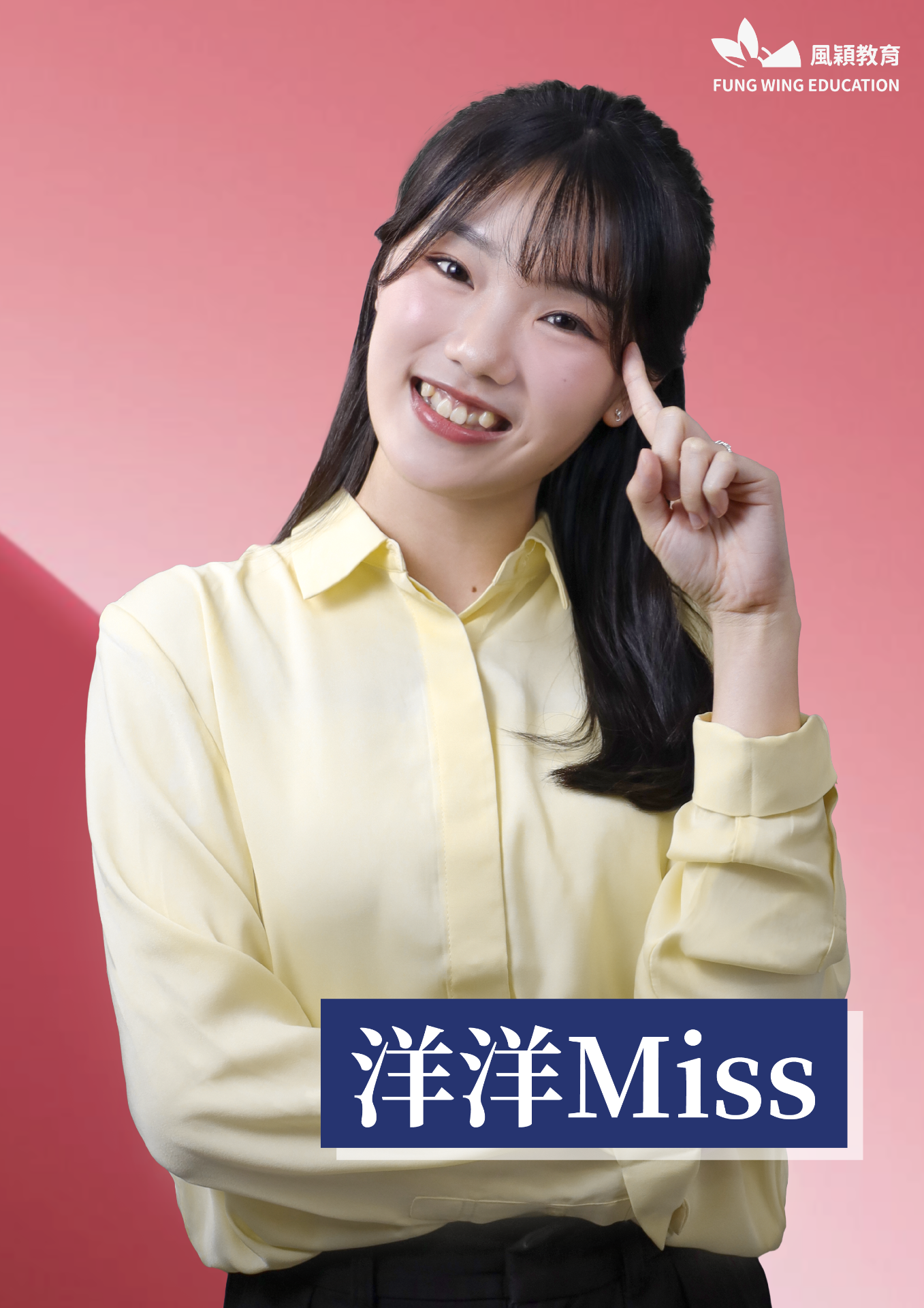洋洋Miss曾修讀中文媒體寫作及編輯課程,並曾任畫室導師四年,指導兒童及青少年繪畫,具備跨領域的教學與輔導經驗。她的課堂以互動與啟發為核心,著重引導學生自主思考,並善於運用圖像與生活案例,把抽象的語文知識轉化為具體的理解。同時,她亦曾擔任青少年輔導義工,懂得傾聽學生的需要,建立真誠的師生互信關係。洋洋Miss期望學生在她的教導下,不僅提升學科成績,更能學會學習,建立韌性,勇於面對學術與人生中的挑戰。